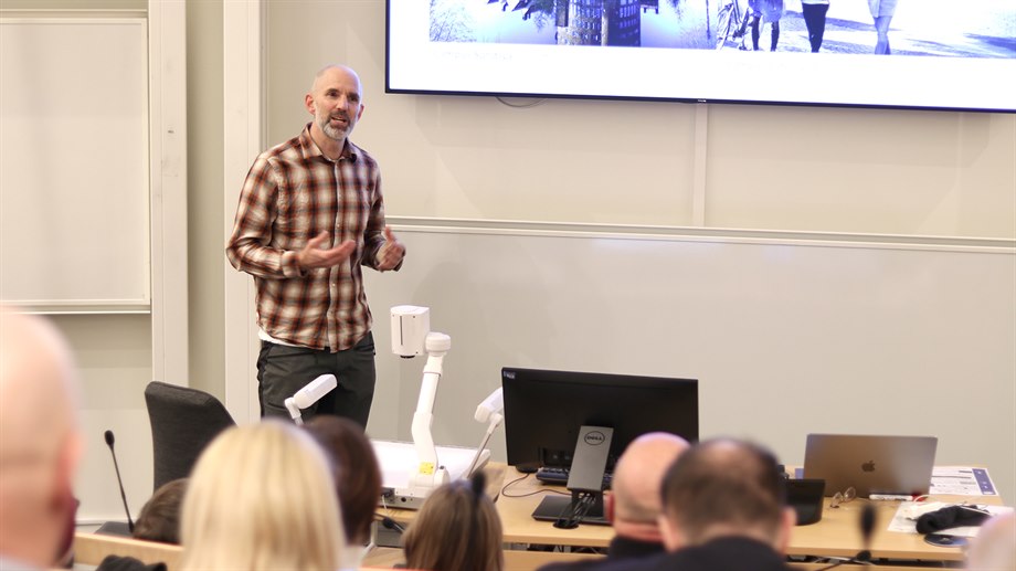 En man i ljus tröja står och presenterar för en publik