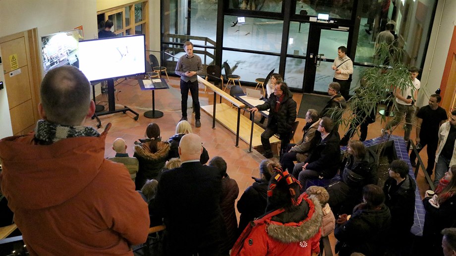 Vid sitt besök på campus Sundsvall fick kommittéerna en kort genomgång av Mittuniversitetet av Prof. Jonas Harvard och Karin Nygård-Skalman. Därefter fick de korta presentationer av ett urval av olika forskningsprojekt relaterade till programmet. Först presenterade Prof. Harvard en förstudie om Air Herding där forskare undersöker möjligheten att valla renar med hjälp av drönare, vilka är fördelarna och vilka utmaningar måste lösas. Dr. Aamir Mahmood presenterade ENSURE 6G, ett nytt projekt finansierat av Interreg Aurora med målet att skapa datadrivna automationslösningar som möjliggörs av robust trådlös anslutning.